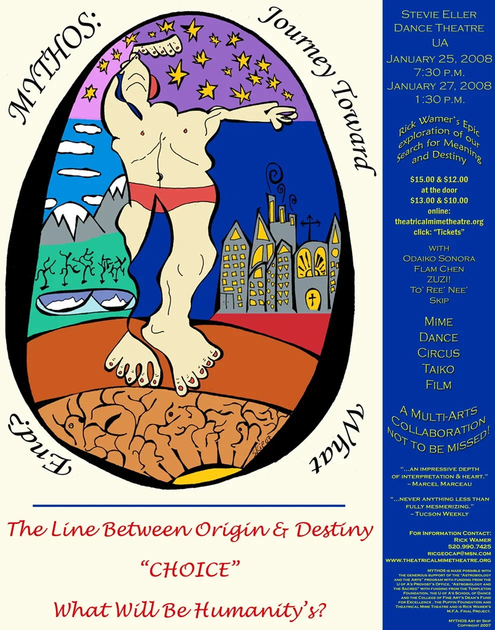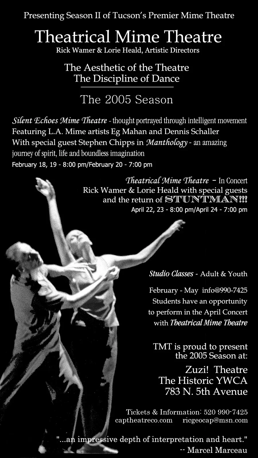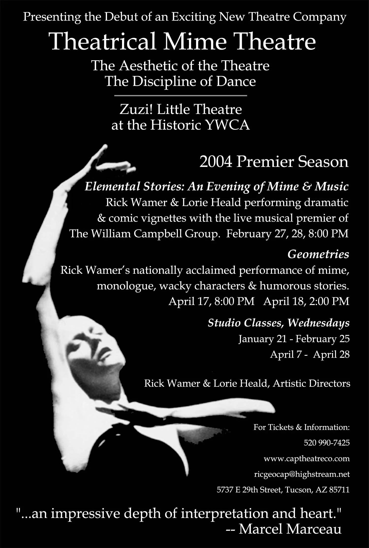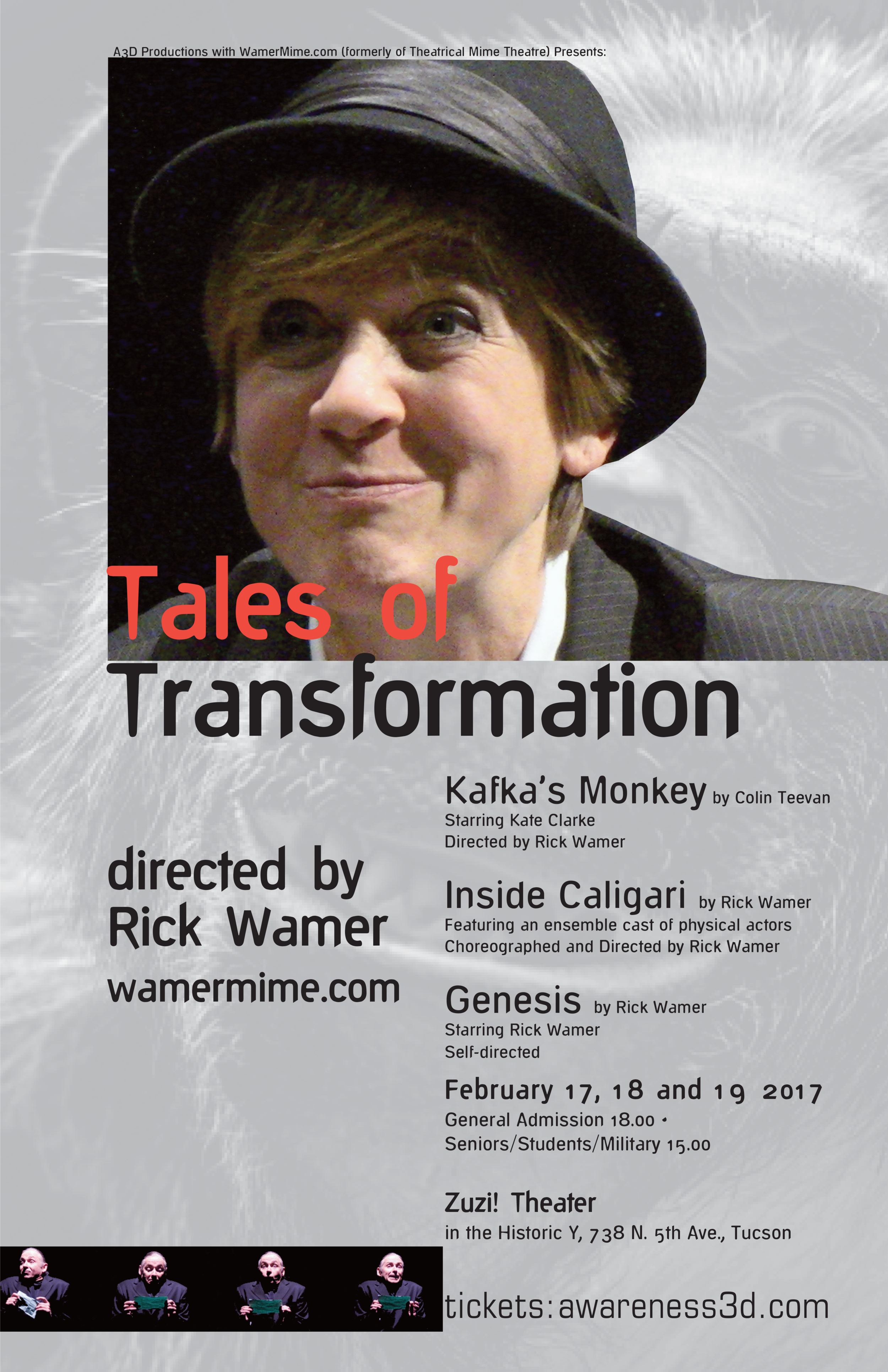 Compared to Chaplin's "Little Tramp", lauded by Marcel Marceau, Rick Wamer creates compelling physical story telling by what some have called "body theatre". International audiences have been enjoying Rick's versatile brand of comedic, lyric, and contagious blend of physicality, story, character, monologue, ensemble, multi-media, mask theater around the globe for over three decades. His recent projects of devised physical ensemble work, he calls Theatre of Metamorphosis, continues to give witness to evolution of his remarkable artistry.